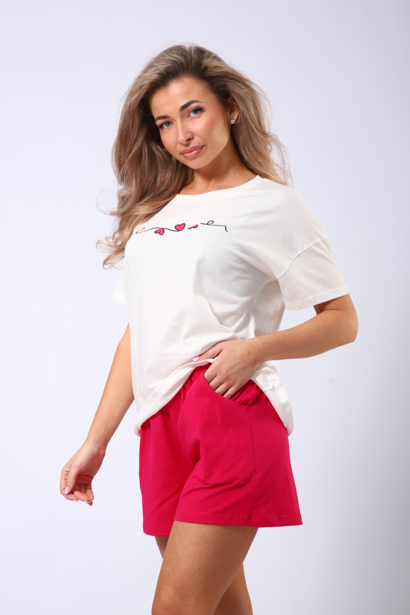 Костюм женский, футболка с шортами . Данная модель выполнена из трикотажного полотна кулирка хлопок 100%. Отличная модель для дома и отдыха. Футболка свободного покроя со спущенным рукавом. На полочке футболки присутствует принт. Шорты с кармашками.